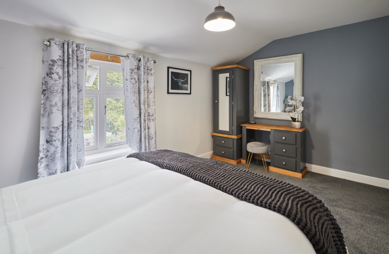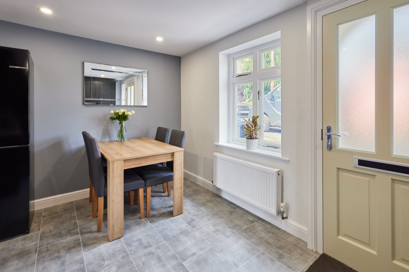 Castle View Cottage has a stylish living room with a flat screen TV and log burner making it the ideal place to unwind with your loved ones. Herringbone flooring and a statement blue feature wall make this a really cosy place to relax. The house has a spacious kitchen diner. Fully equipped for self-catering stays, the kitchen has modern appliances and cookware. The dining area includes a dining table with four chairs.
