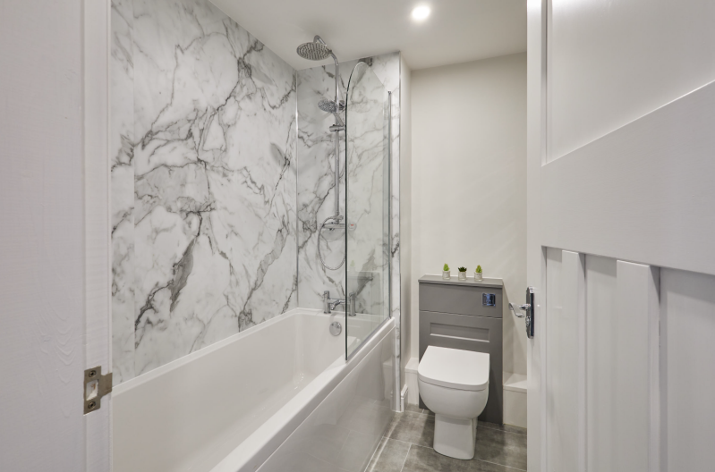 The family bathroom has a spacious bath with overhead shower, WC and basin.